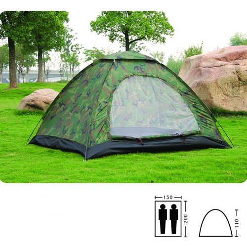 Description: The woodland camouflage blends well with any wooded area and helps keep your camp concealed. The light weight and small pack size makes this tent easy to add to your pack. Comfortable to live in for two people Advanced venting system increases air circulation within the tent Size: 200cm 150cm 110cm Folded package size: 60cm 12cm 8.5cm Package Weight: 1525g Color: Camo Package included: 1 x Camping Tent